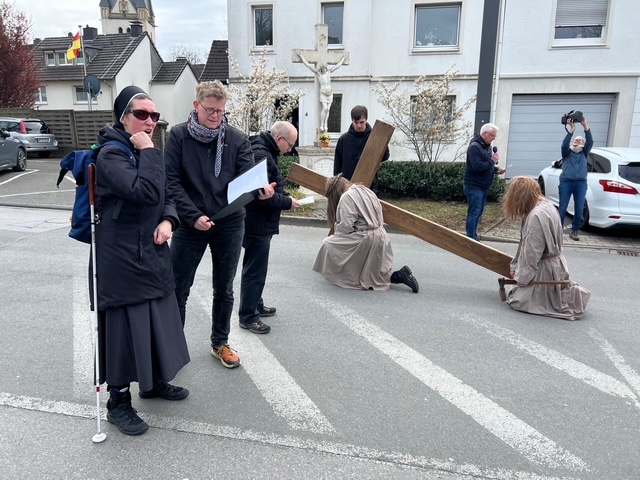 Am Karfreitag wurde die traditionelle Kreuztracht in Menden in diesem Jahr erstmals auch in Gebärdensprache begleitet. Sr. Judith und eine Gebärdensprachdolmetscherin haben die Stationen des Kreuzweges für gehörlose Teilnehmende übersetzt und damit eine aktive Mitfeier ermöglicht.